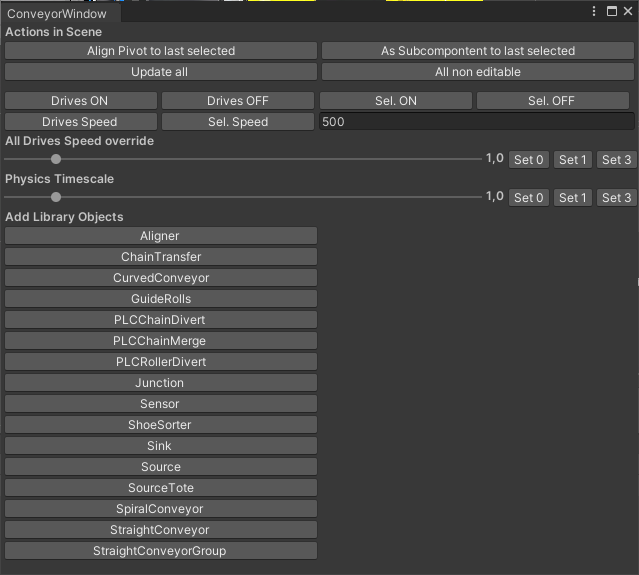 This window can be used to control all conveyors or to set their default speed. It is also possible to speed up all drives via speed override, while keeping the simulation time. I.e. the drives become physically faster. It is also possible to change the physics timescale, so that the simulation runs faster or slower like in a time lapse.