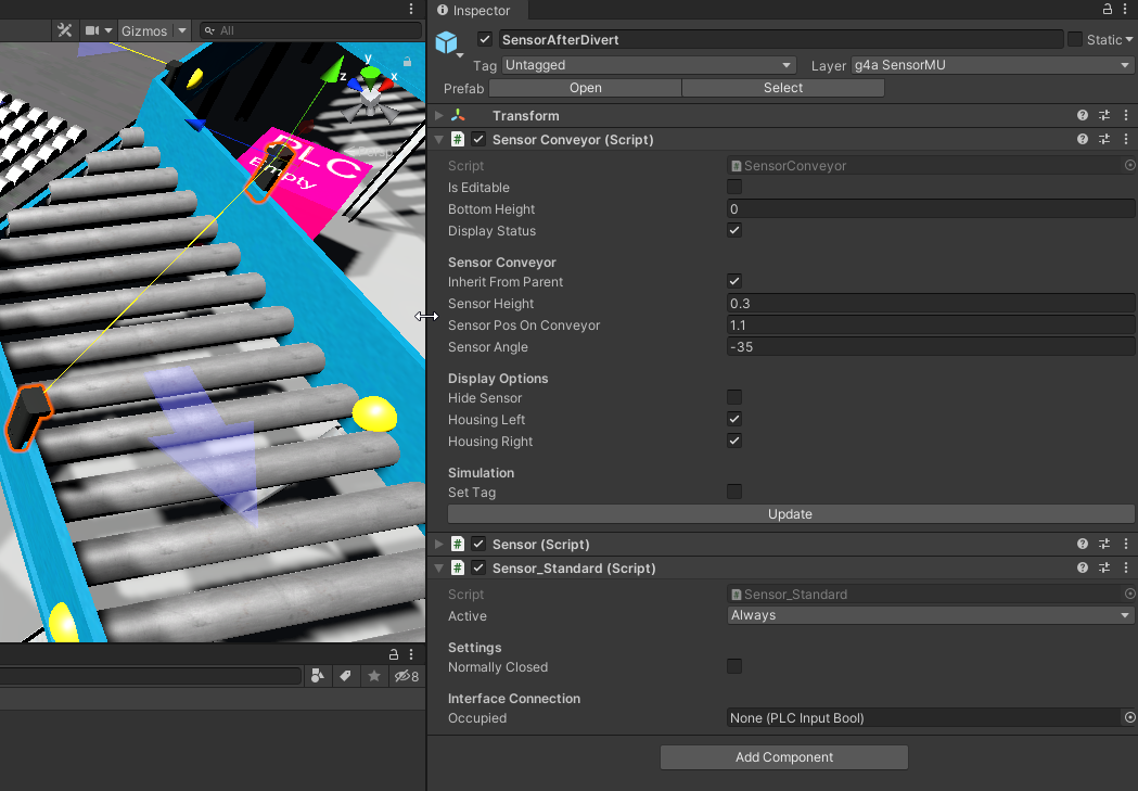 The sensor is based on the standard realvirtual.io[ Sensor](https://doc.realvirtual.io/components-and-scripts/sensors/sensor). Additionaly it has some parameters specially for conveyor systems and can be places separately or as a sub component on conveyors. If a sensor is placed as a subcomponent on conveyors it is automatically aligned with the Conveyor direction and position.