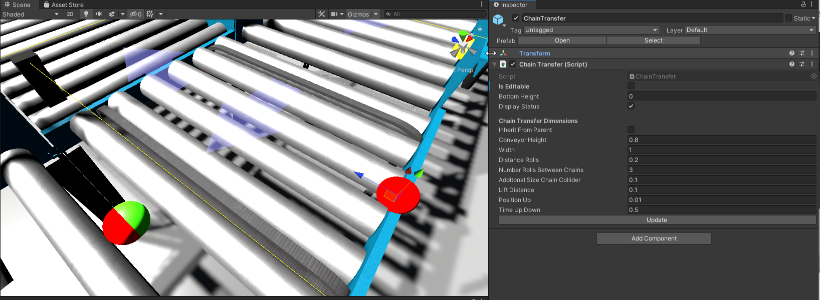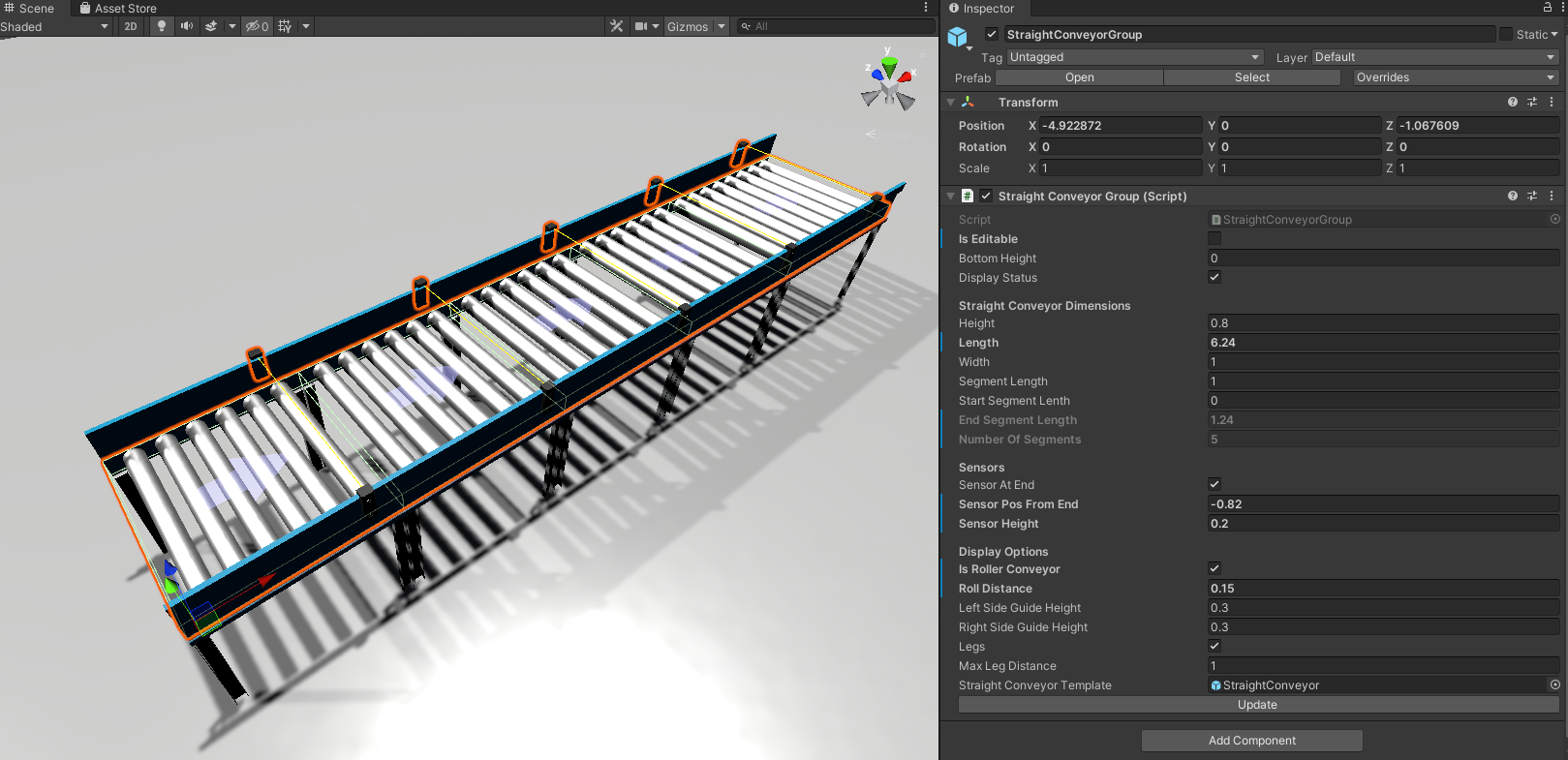 The Straight Conveyor Group automatically creates multiple straight conveyors as sub components. The "UseGuidedTransport" option can also be set.