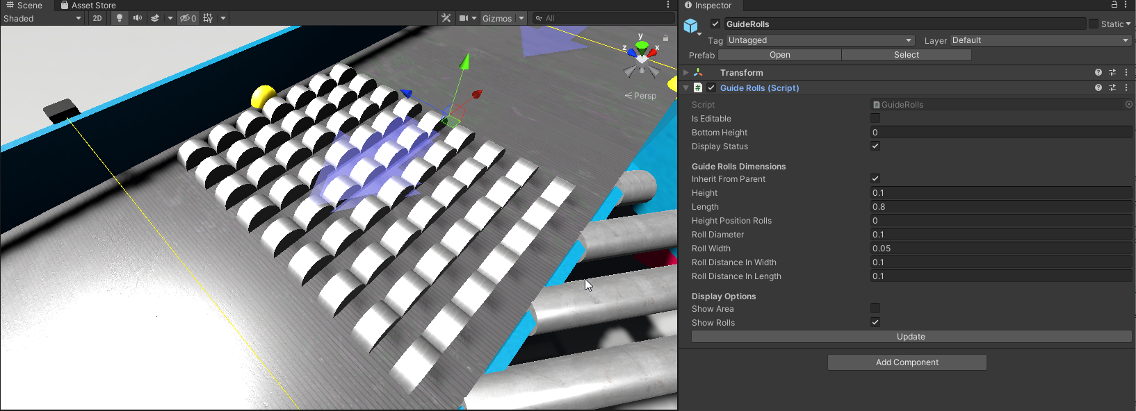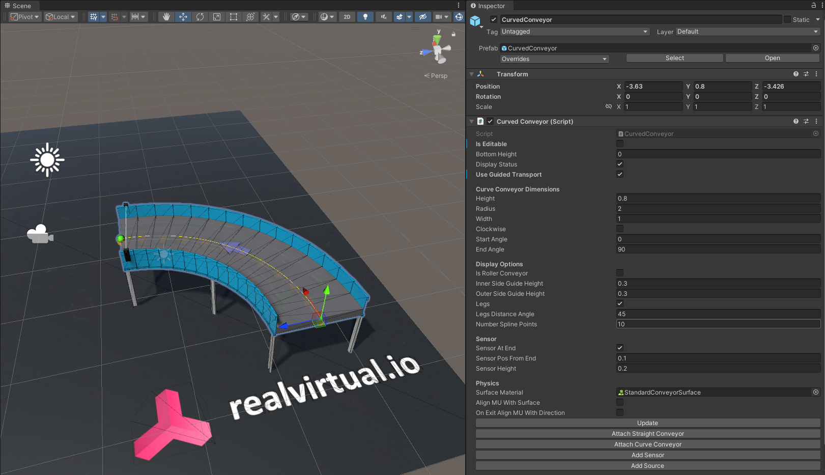 The Curved Conveyor can be displayed as a roller conveyor or belt conveyor. It has SnapPoints on each end. Each conveyor has automatically a sensor at the end. Additionally, the conveyor offers a guided transport system along a spline situated in the middle of the transport surface. This feature can be activated by ticking the checkbox "UseGuidedTransport". When enabled, items will follow a predefined path, ensuring precise and consistent movement along the conveyor. In this mode, Unity physics do not affect the transported object.