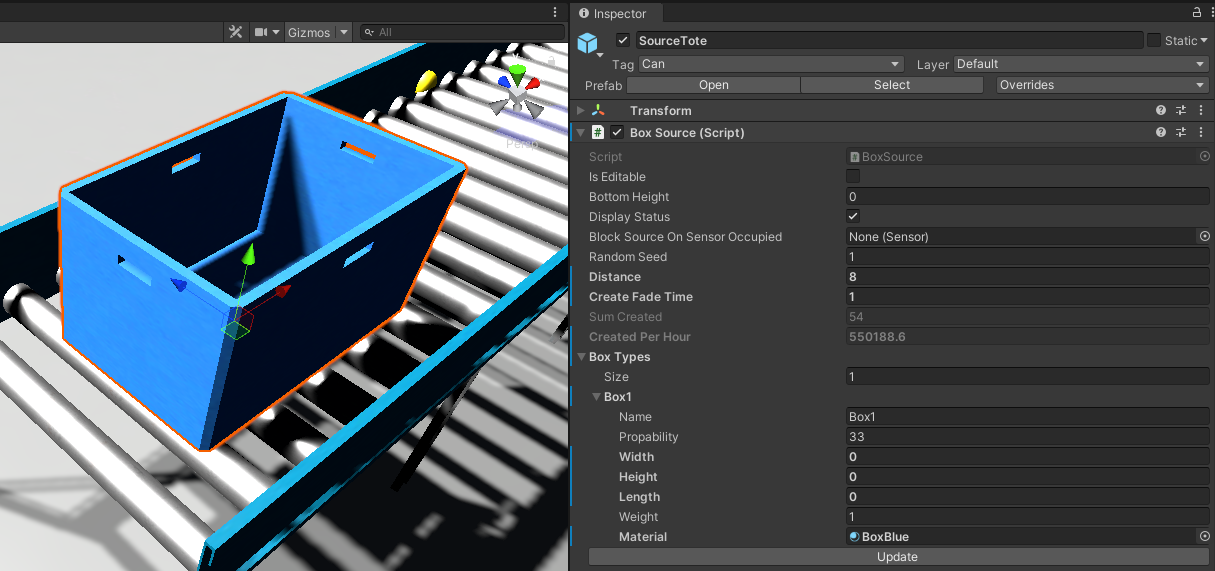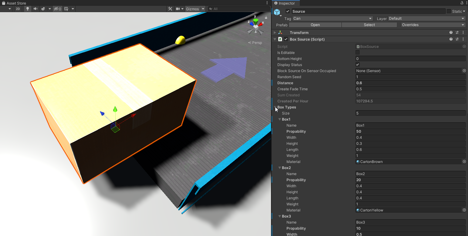 The source is based on the standard realvirtual.io[ Source](http://localhost:4000/source.html). Goods with different dimensions and weights can be automatically created. The source is always trying to keep a defined distance between the produced goods. If you want to have a different look of the goods you can create your own source and exchange the included meshes.